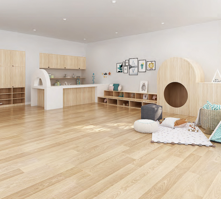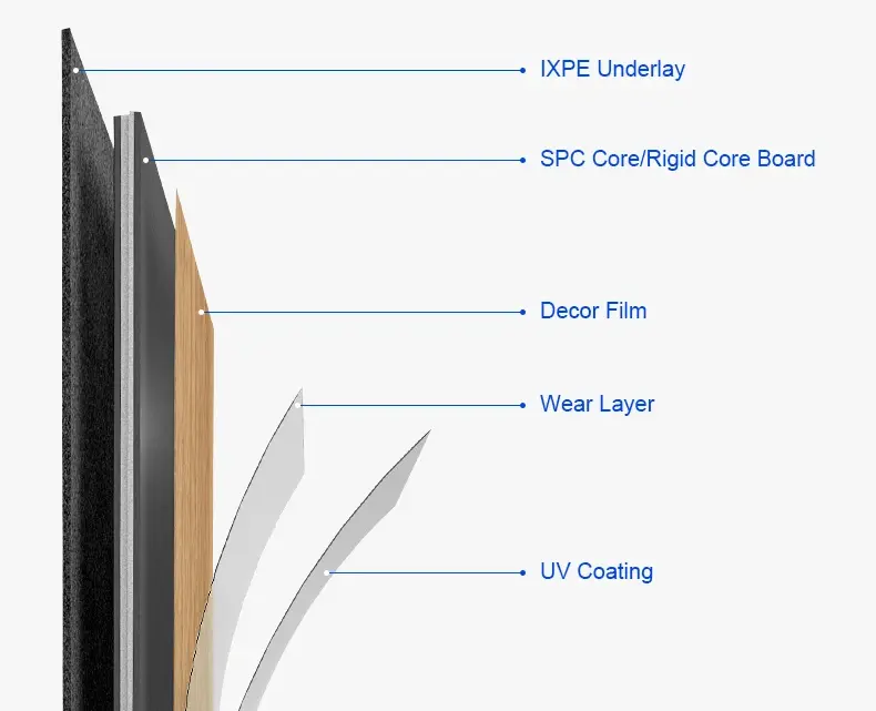 While the core is rigid, Our  SPC flooring products come with an attached underlayment (like EVA foam or IXPE foam) that provides a softer feel underfoot, improves sound absorption, and adds insulation, contributing to a more comfortable and quieter living space.